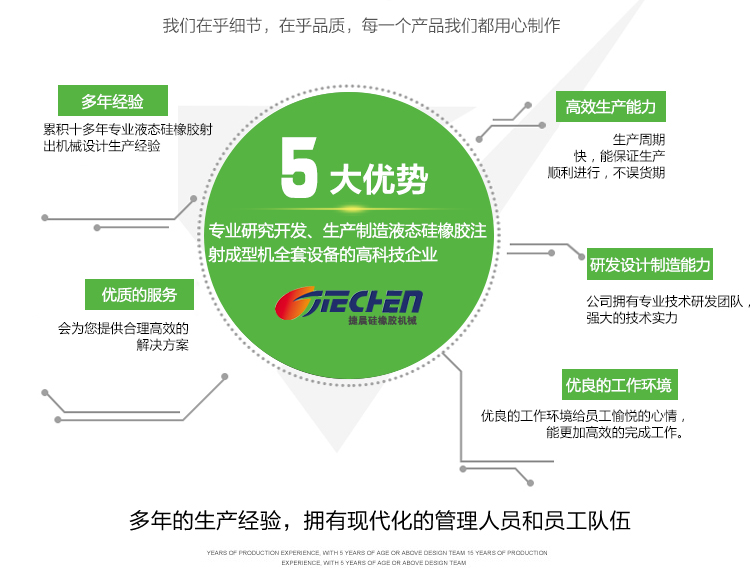 東莞市捷晨硅橡膠機(jī)械有限公司是專業(yè)研究開發(fā)、生產(chǎn)制造液態(tài)硅膠射出成型機(jī)全套設(shè)備的高新企業(yè)。公司擁有專業(yè)技術(shù)研發(fā)團(tuán)隊,強(qiáng)大的技術(shù)實力,完善的售后體系,為客戶提供強(qiáng)有力的技術(shù)及服務(wù)保障。公司設(shè)備先進(jìn),工藝完善,技術(shù)力量雄厚,累積十多年專業(yè)液態(tài)硅橡膠射出機(jī)械設(shè)計生產(chǎn)經(jīng)驗,取得多項發(fā)明專利,在行業(yè)內(nèi)達(dá)到了領(lǐng)先技術(shù)水平。